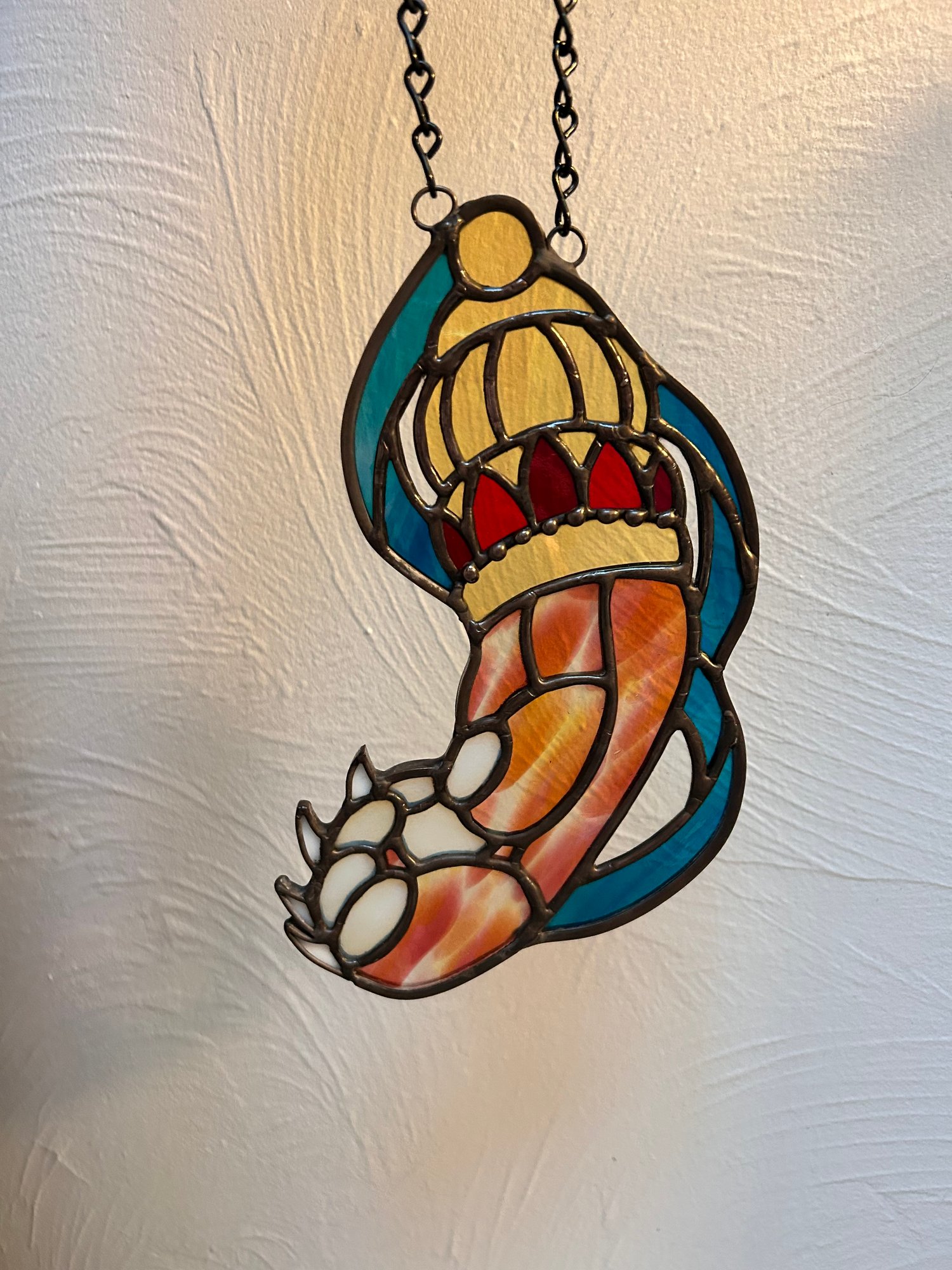 All pieces are hand cut, foiled or leaded, soldered, finished and some hand painted, by me. My patterns are always my unique creations as well.